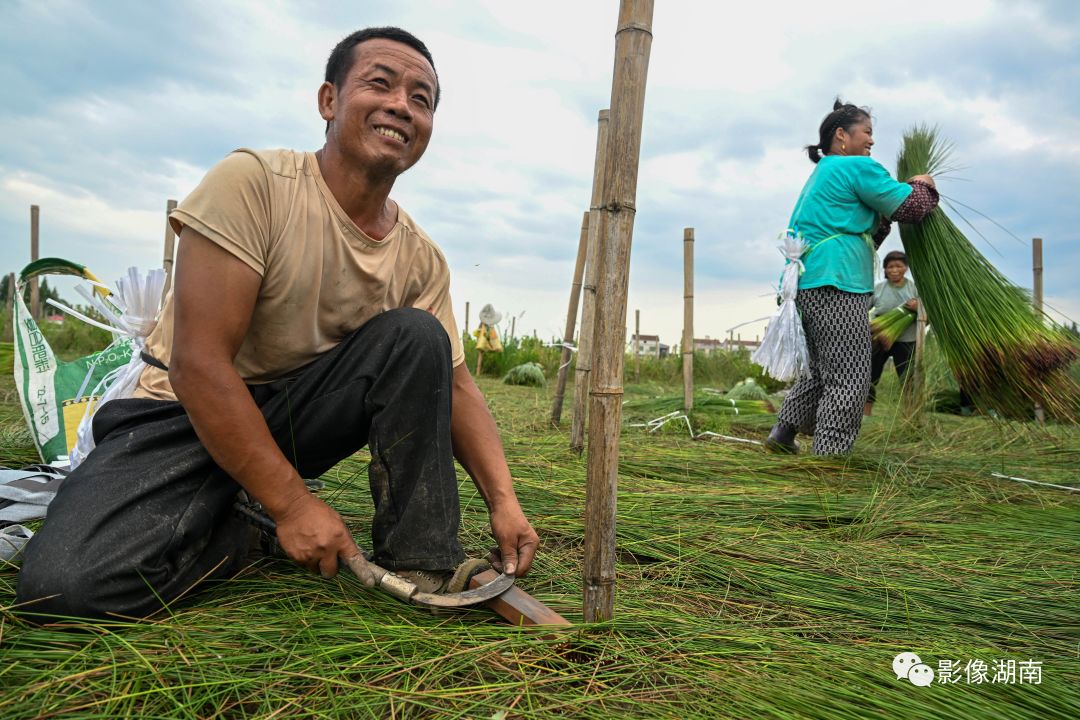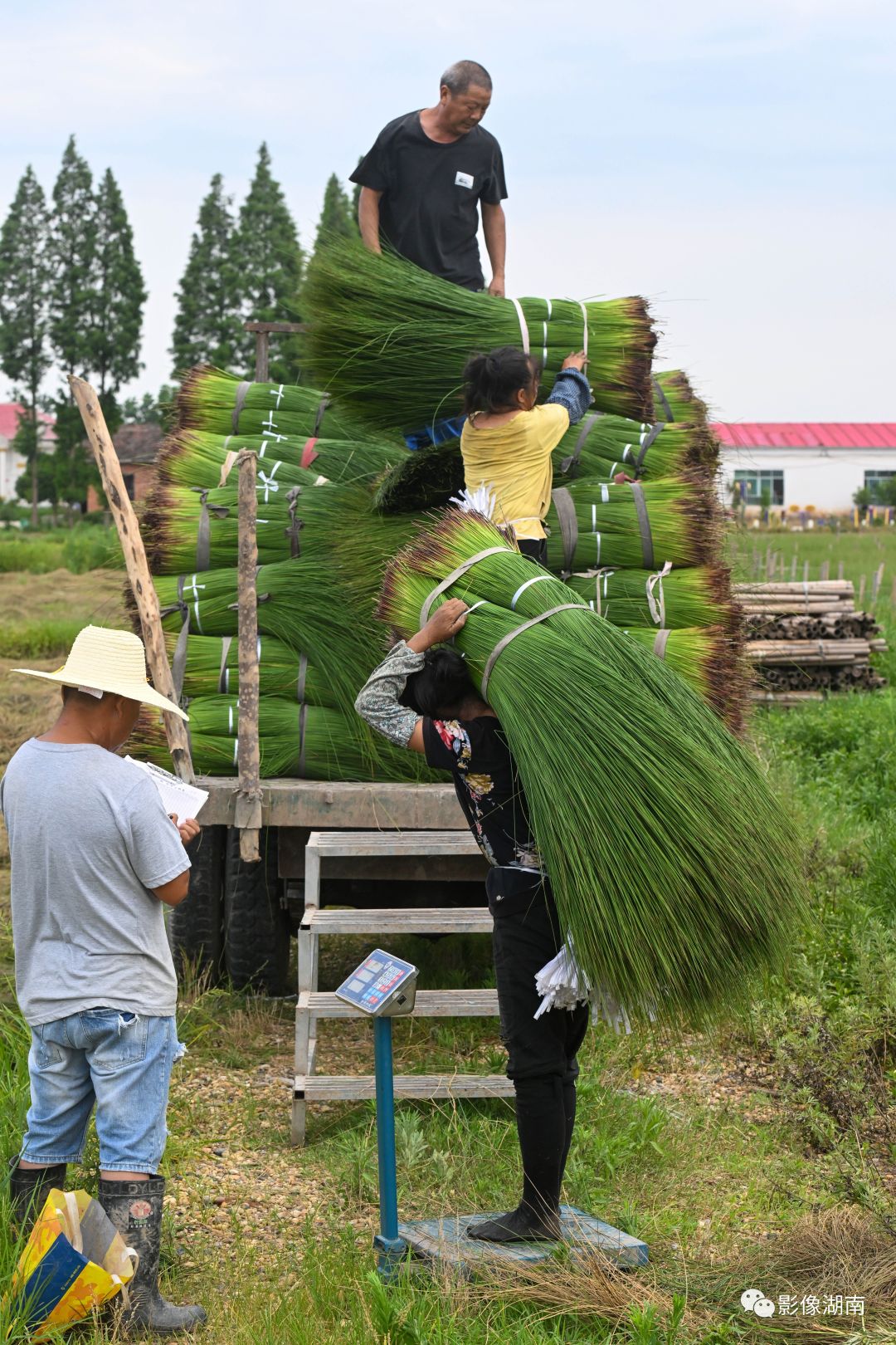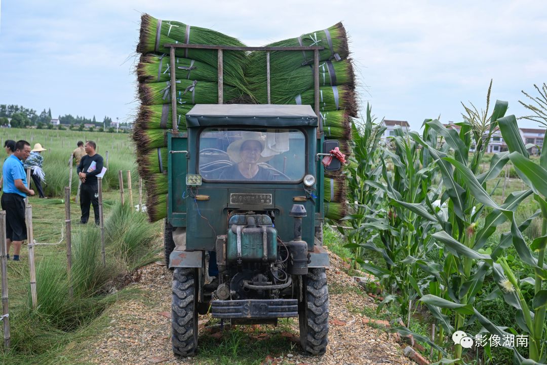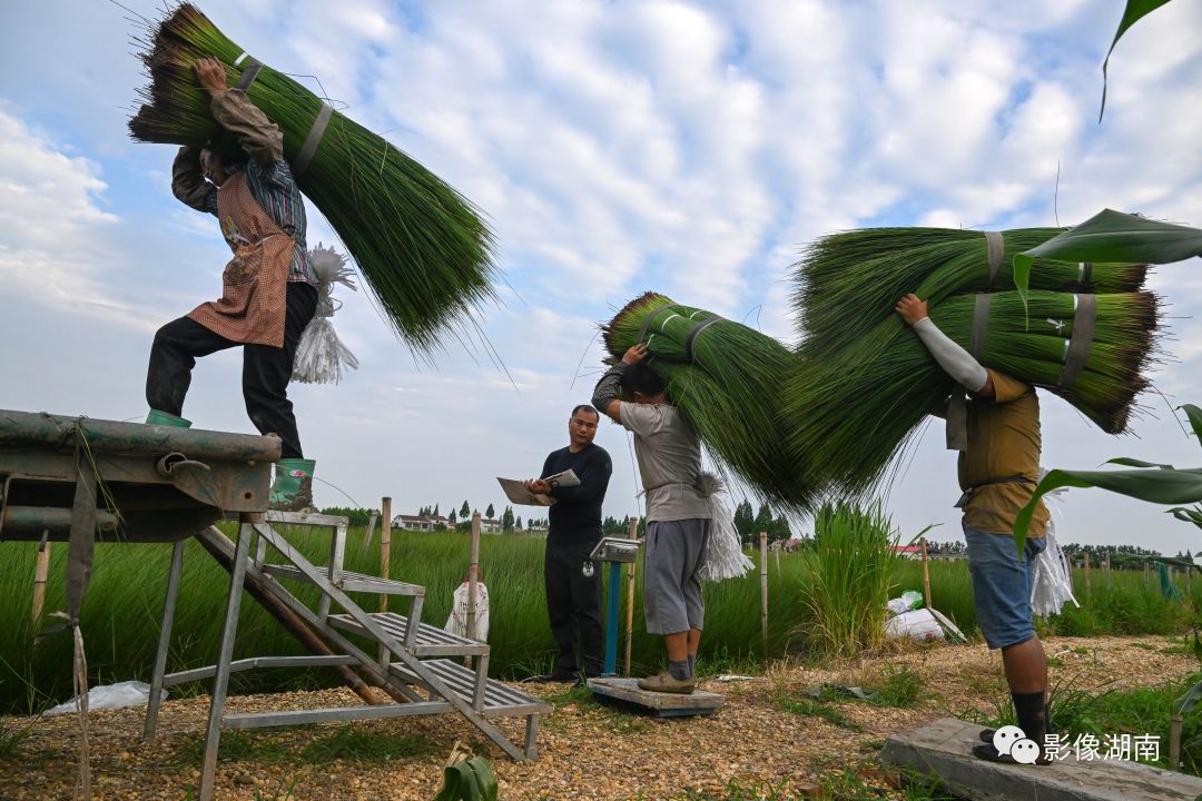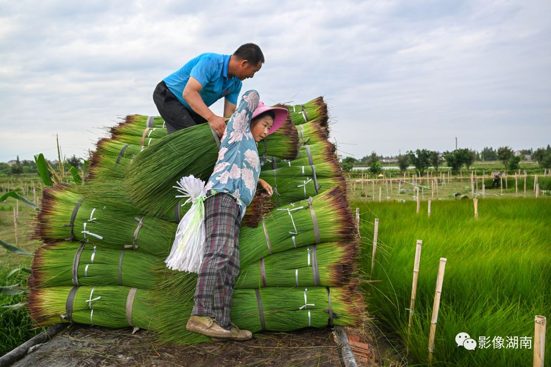6月22日清晨,沅江市四季红镇四季红村,数十名割草工人熟练地收割、打捆、装运蔺草,一片繁忙。新鲜收割的蔺草让宽阔的绿色田野弥漫着独特香气。