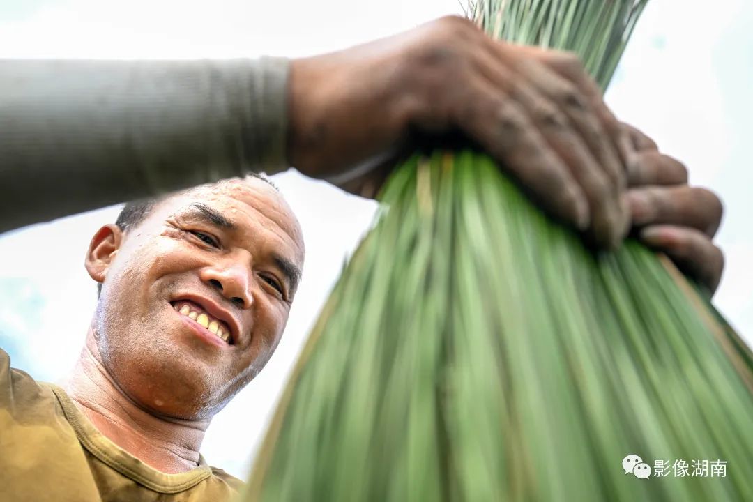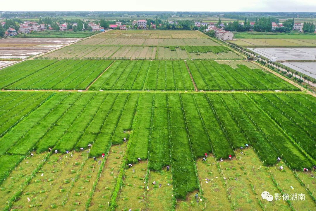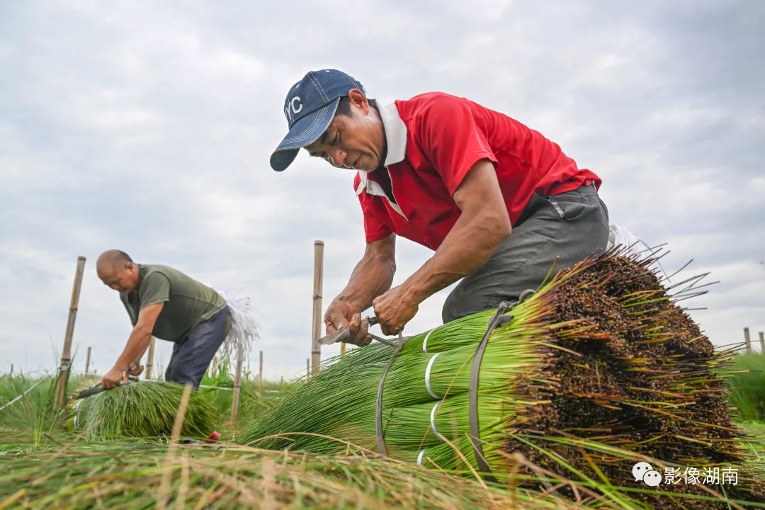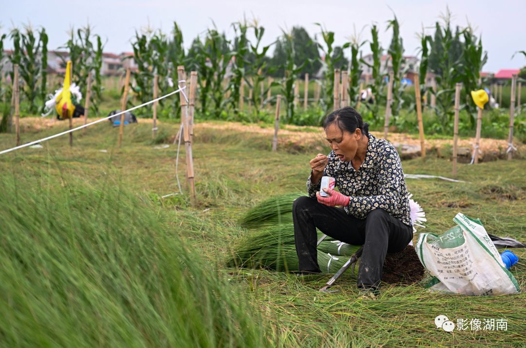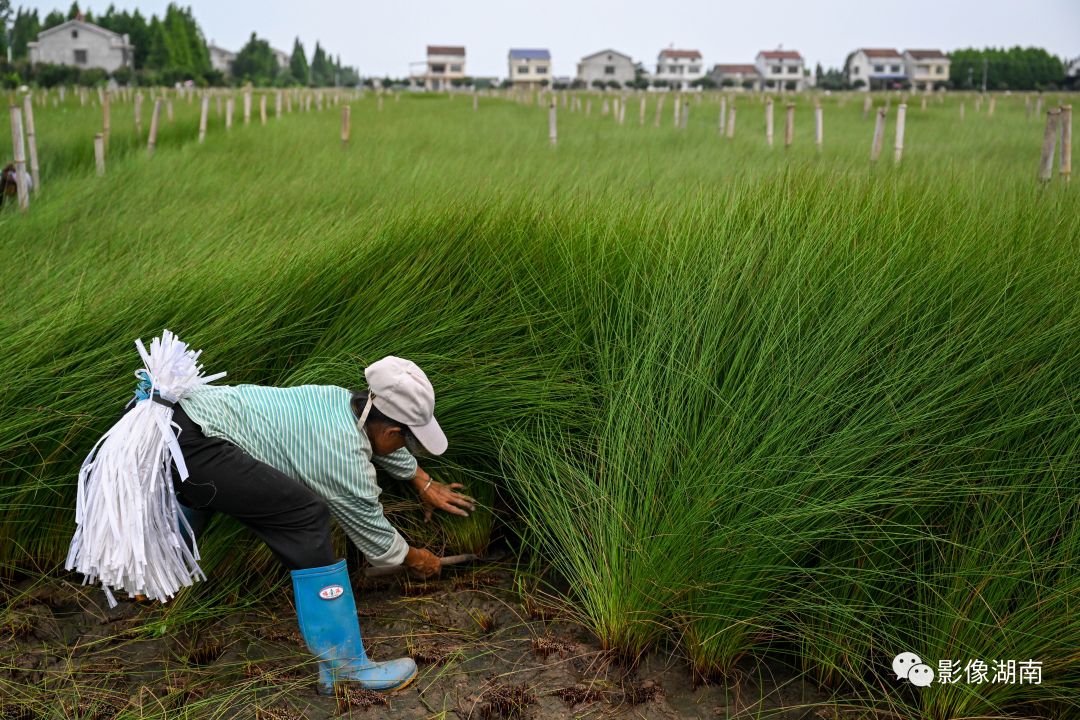 6月22日清晨,沅江市四季红镇四季红村,数十名割草工人熟练地收割、打捆、装运蔺草,一片繁忙。新鲜收割的蔺草让宽阔的绿色田野弥漫着独特香气。