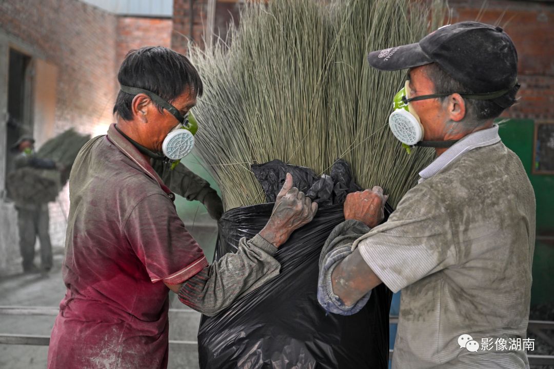 沅江市四季红蔺草工艺品加工有限公司车间内,工人正在搬运染色好的蔺草。