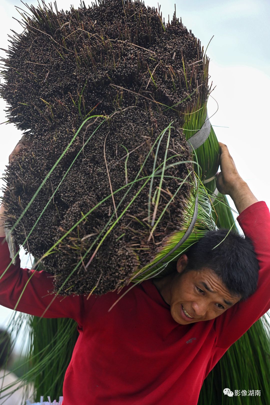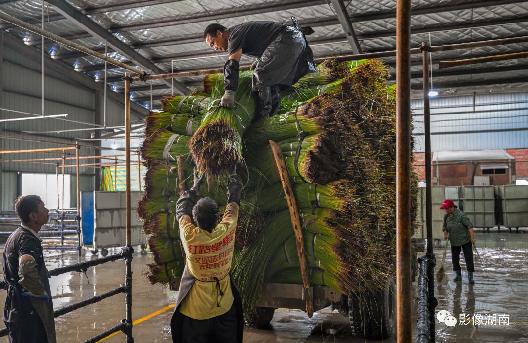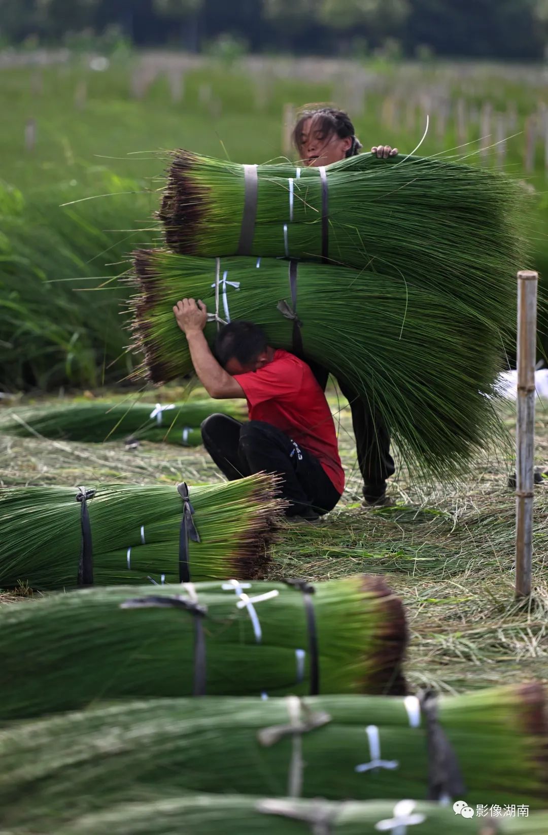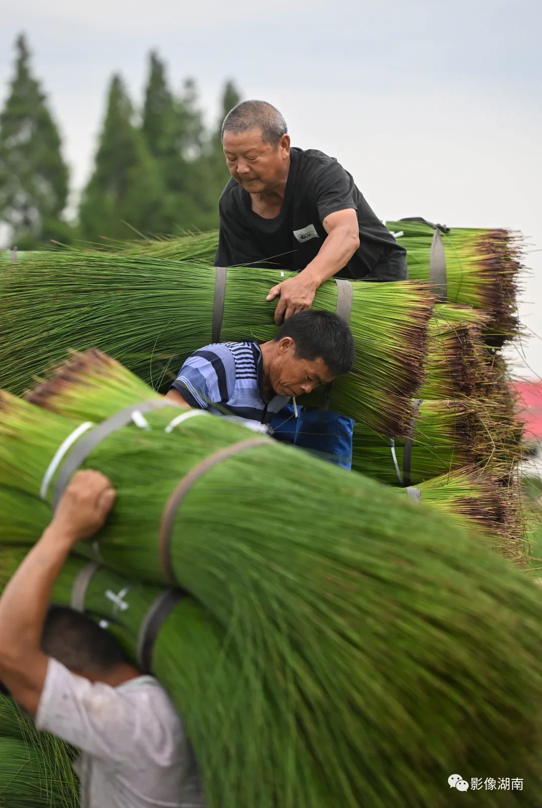 沅江市四季红镇四季红村蔺草种植基地,蔺草收割工人将打捆的蔺草搬运装车,用汗水收获希望。
