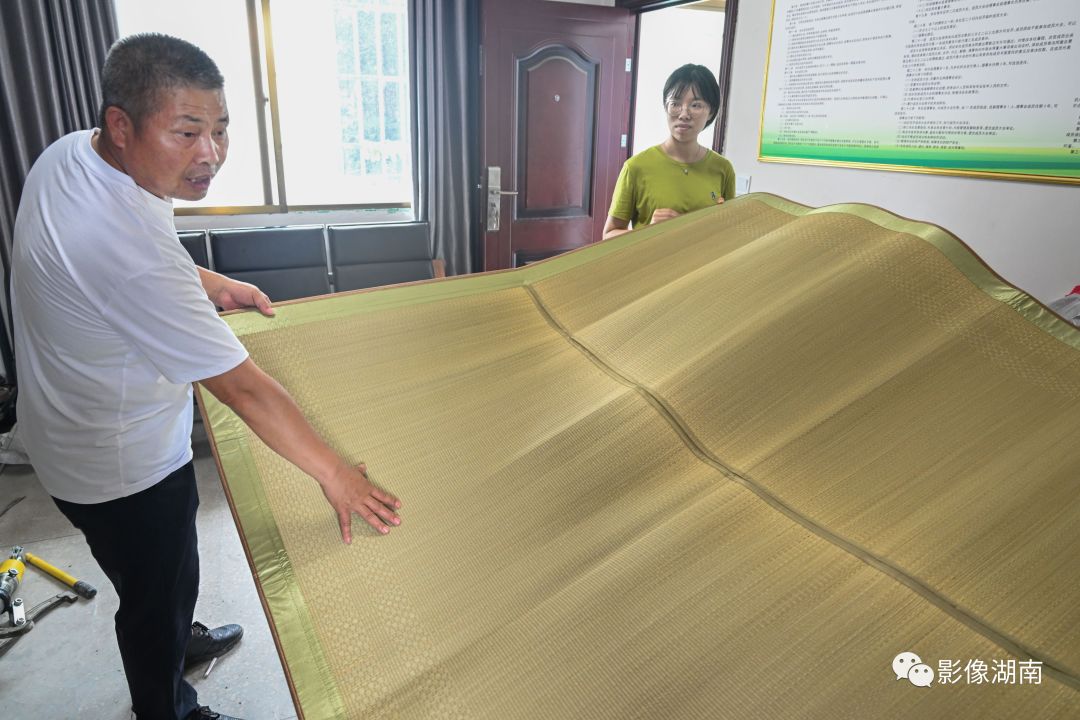 沅江市四季红蔺草工艺品加工有限公司车间,负责人展示加工生产的蔺草样品。