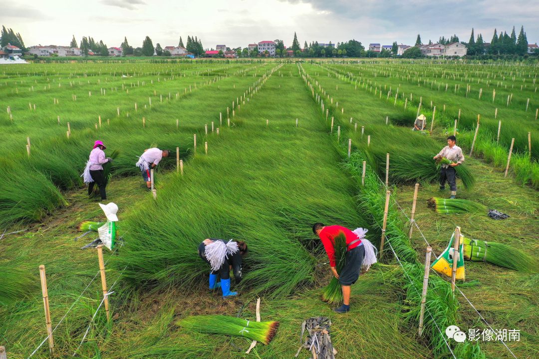 沅江市四季红镇四季红村蔺草种植基地,田间里成捆的蔺草和忙碌的蔺草收割工人成为一道风景。