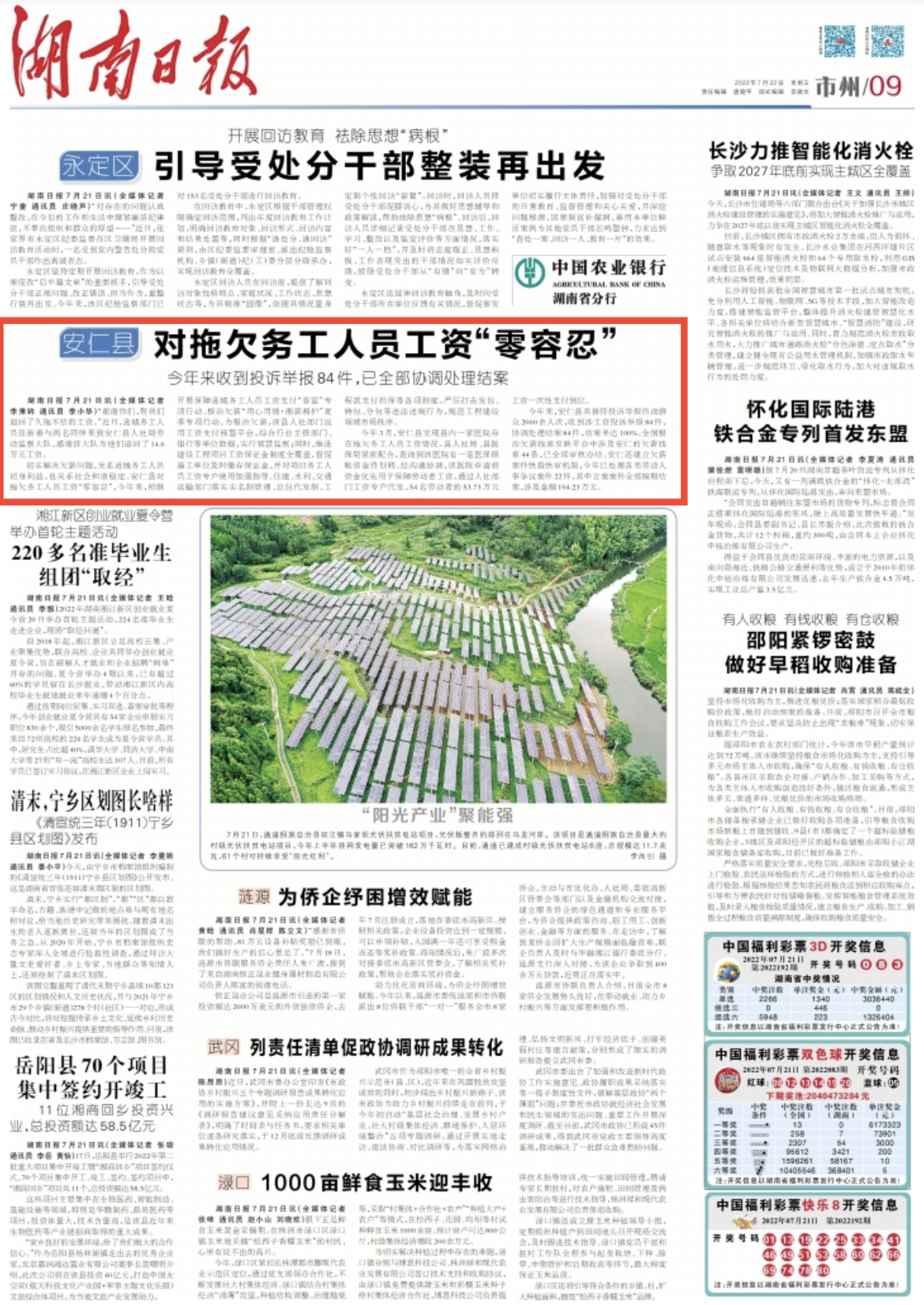 切实解决欠薪问题,关系进城务工人员切身利益,也关系社会和谐稳定。安仁县对拖欠务工人员工资“零容忍”,今年来,相继开展保障进城务工人员工资支付“春雷”专项行动、根治欠薪“用心用情·湘薪湘护”夏季专项行动。为根治欠薪,该县人社部门运用工资支付预警平台,综合行业主管部门、银行等单位数据,实行智慧监察;同时,推进建设工程项目工资保证金制度全覆盖,督促施工单位及时缴存保证金,并对项目务工人员工资专户使用加强指导。住建、水利、交通运输部门落实实名制管理、总包代发制、工程款支付担保等各项制度,严厉打击发包、转包、分包等违法违规行为,规范工程建设领域市场秩序。