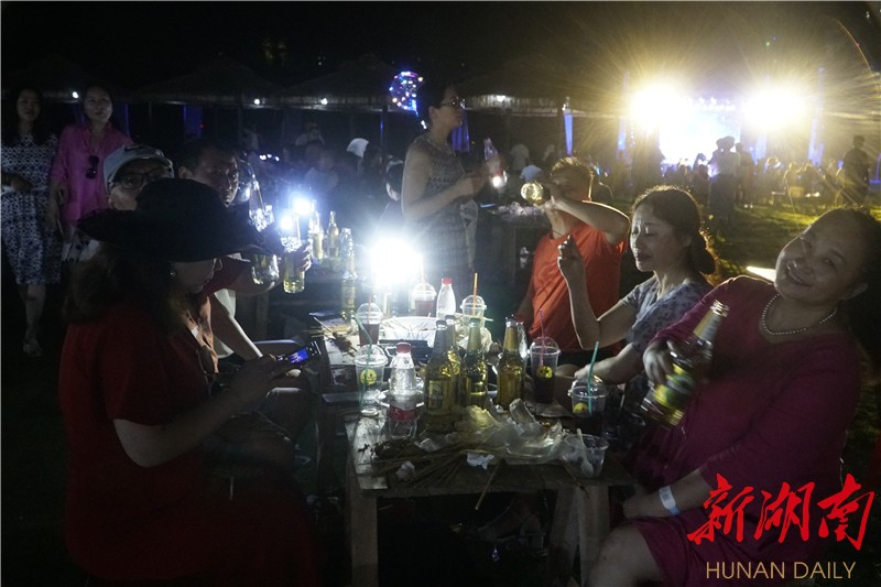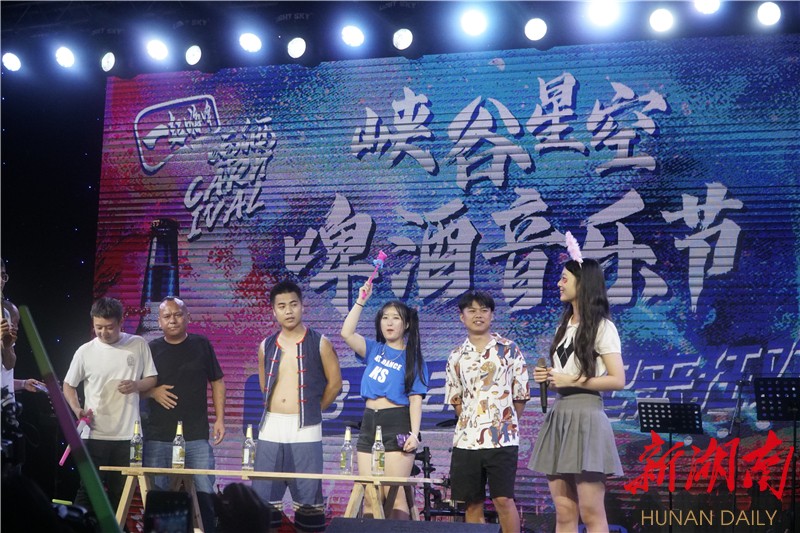 当日晚7时30分左右,在海拔约680米的矮寨峡谷星空露营基地,伴着热情的摇滚乐畅饮啤酒,吸引数千名市民游客共同嗨玩。啤酒、音乐成了的主角。