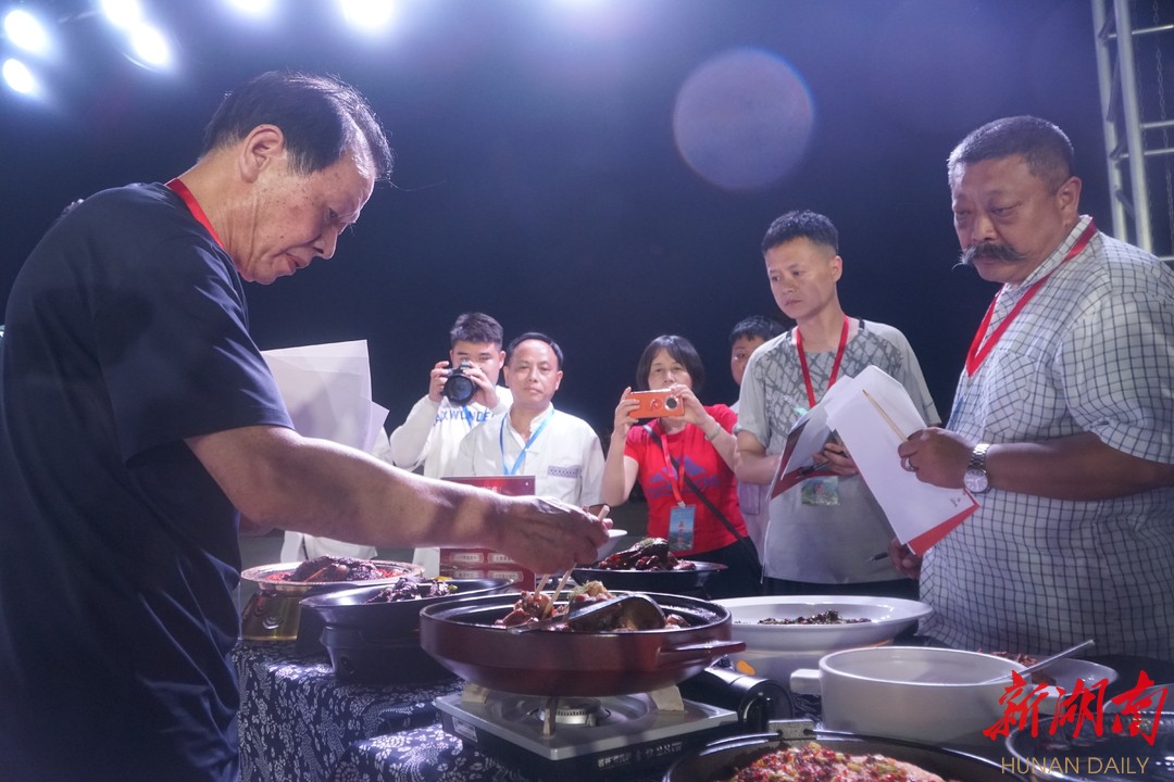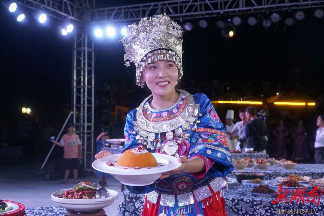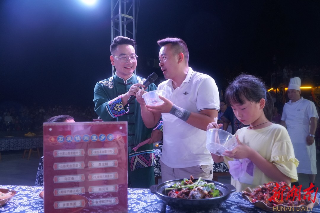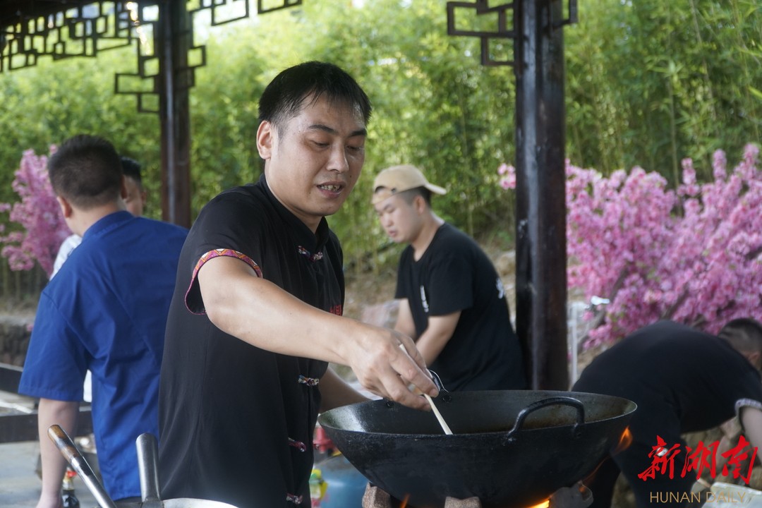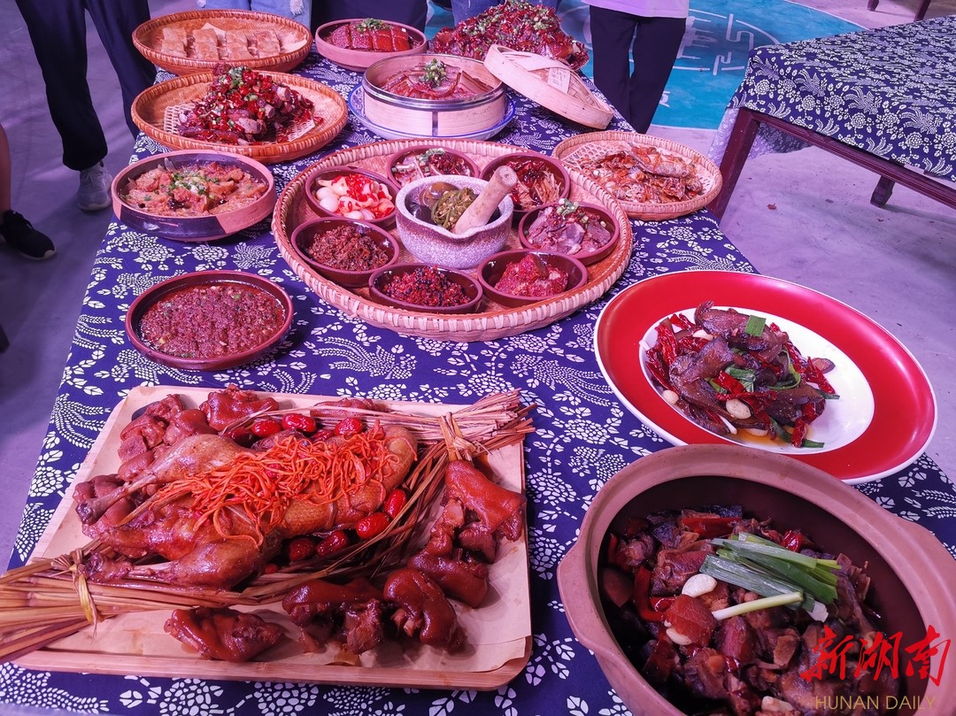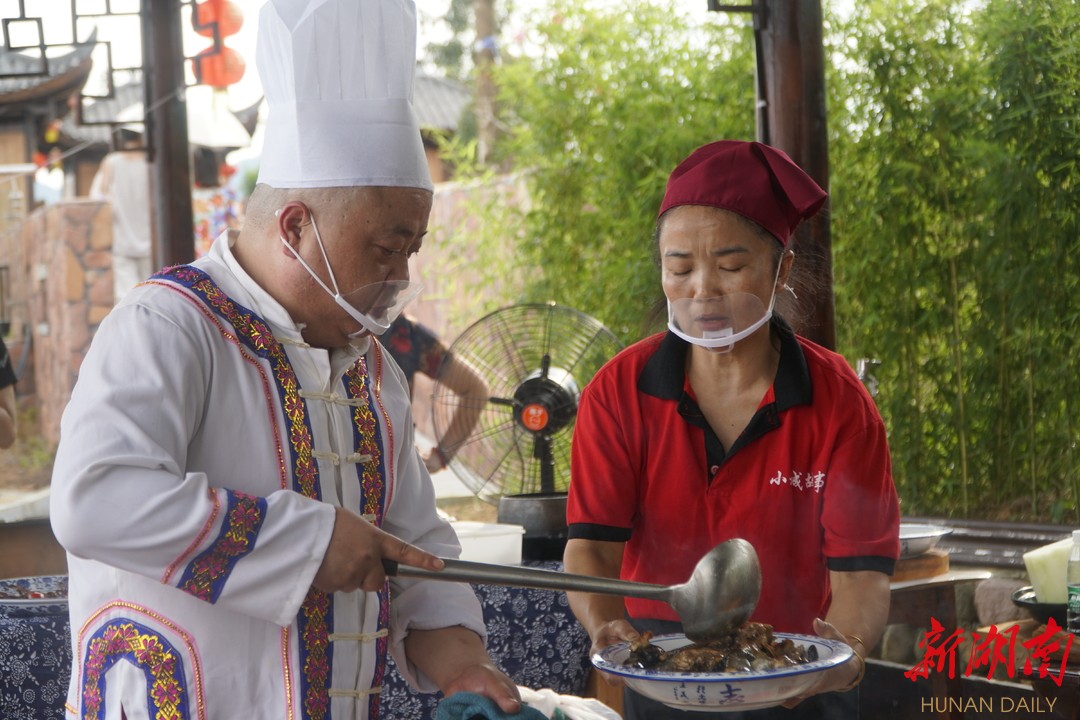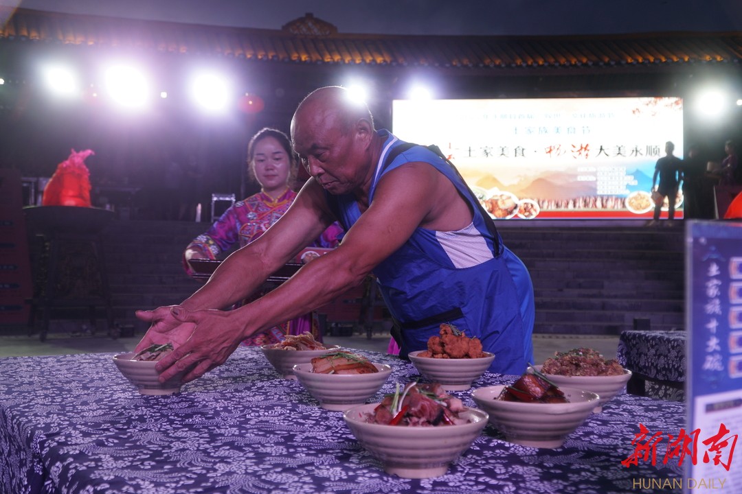 土司大营篝火广场边的长廊成了天然的厨房,土家十大碗、农家厨房、湘土苗寨、木房子腊味馆、石镇湘里乡亲、小城故事、静贤居郭三疯、喜兰餐饮8支参赛队伍的大厨,正忙着掂锅挥勺,农家锅巴、坨坨肉、枞菌酸辣糊、带皮大片黄牛肉、湘西茶油霸王鸭、腊肉烟笋等一道道美食随即出锅。