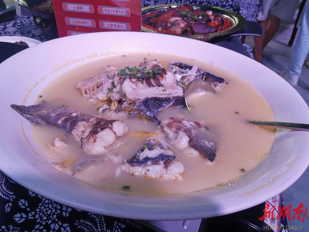 美味还在制作,现场市民及游客已经迫不及待。19时43分,在大家期盼中,菜品一一上桌。静贤居郭三疯制作的牛头宴第一个出场。浇淋着特制辣椒油的牛头,由两名土家族汉子抬出,就引发现场一阵喝彩。喝彩声还未停歇,乡里人家的山旮旯血豆腐,农家厨房的腊猪脚炖干猪脚,土家十大碗,木房子腊味馆的鱼头王、腊猪脚炖甲鱼等近100道菜先后上桌。