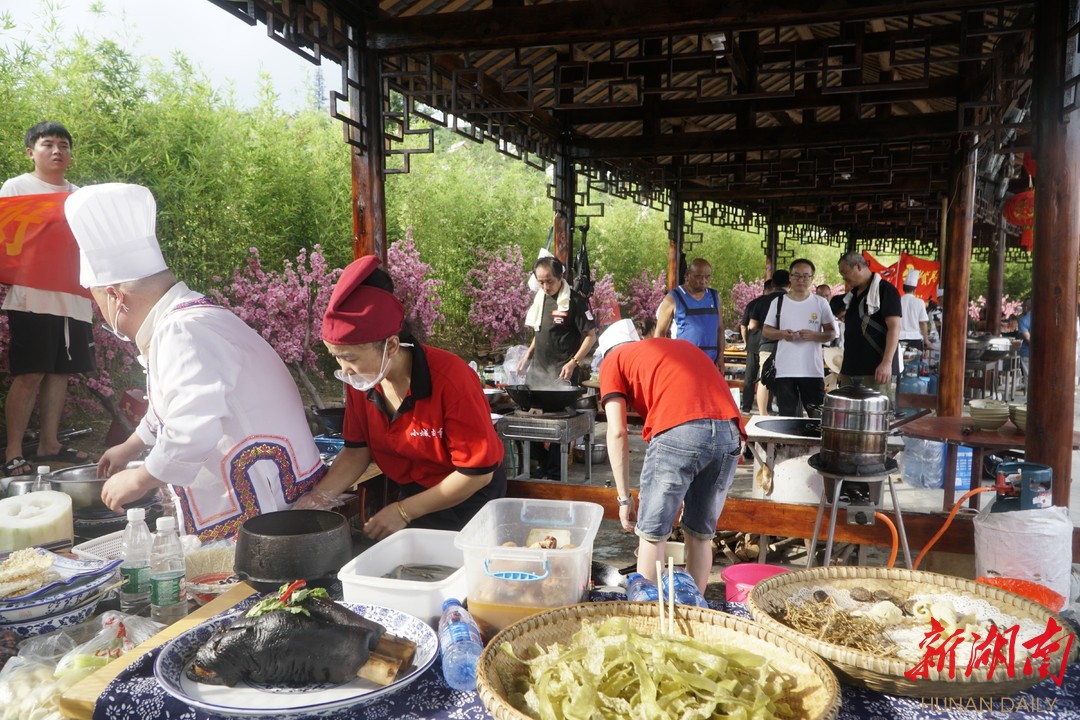 作为永顺县首届土家族美食节,不仅菜品取材永顺本地的山林,菜名也是具有浓浓的土家族味道——溪州倒毛鸡、土司稻香鸭、毕兹卡金银蹄、万马归朝……吸引游客边边看炒制边探秘解读。