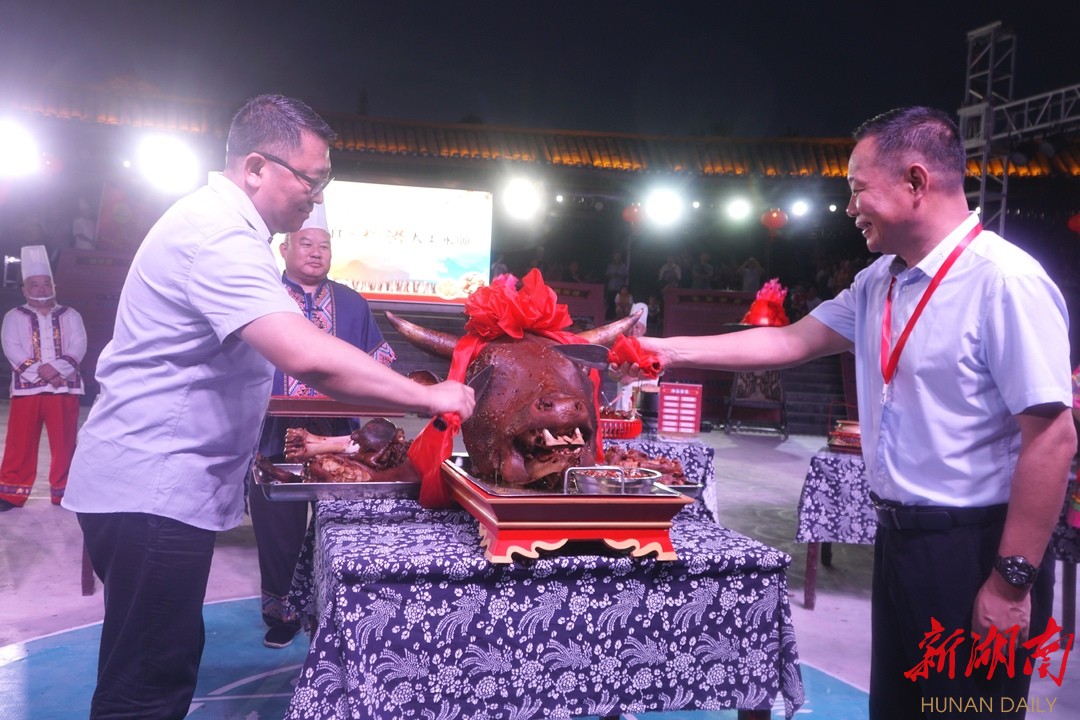 湘西州州委常委、州纪委书记、监委主任施健鑫,湖北省恩施州州委常委、副州长王磊,共同为土家族美食节牛头宴剪彩、执牛耳、动刀俎。