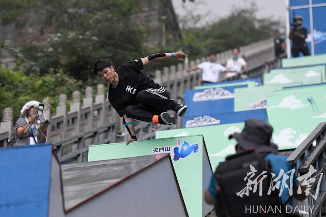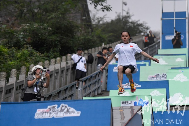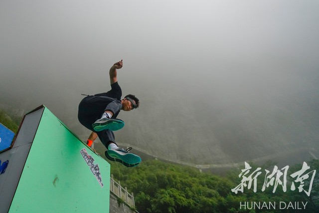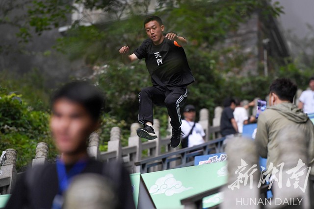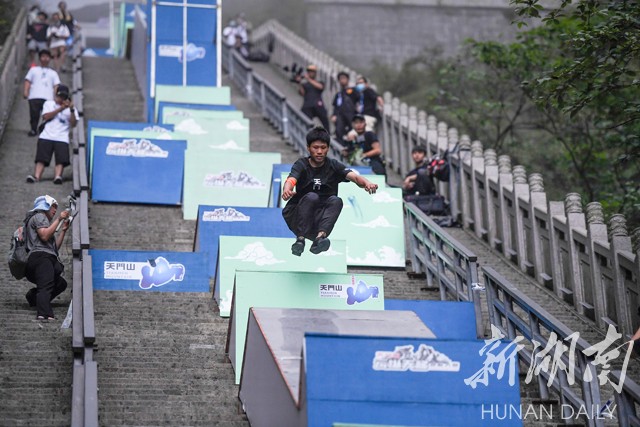 7月23日,张家界天门山“云纵天梯”跑酷大赛开赛,来自全国69位跑酷选手齐聚天门山999级“天梯”,在陡峭赛道上同场竞技。该赛道全长近300米,垂直落差达150米,共设置108组障碍道具。湖南日报·新湖南客户端记者 向韬 摄