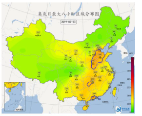 2019年9月23日,华北平原和珠三角区域首先出现臭氧浓度超标,此后,臭氧污染超标区域进一步扩大并向内陆延伸,29日形成了北起沈阳、南至海口、东起宁波、西至重庆的臭氧污染带,覆盖近320万平方公里国土面积,污染带内臭氧浓度日评价值的平均值超过200微克/立方米。