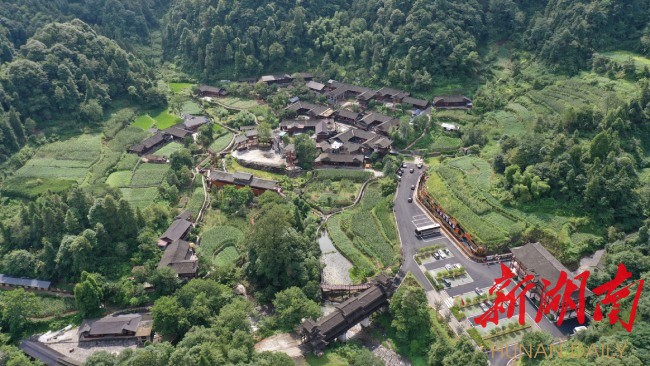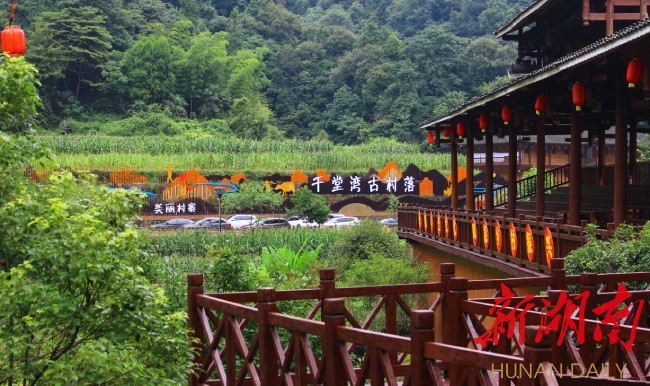 千堂湾古村寨有45户155人,以土家族为主。淳朴的民族风俗、古色古香的传统木屋、独有的盘木号子、深情的山歌对唱、精致的土家织锦相映成趣。通过挖掘典妻文化,打造《狃子花开》实景剧,实现文旅融合发展。