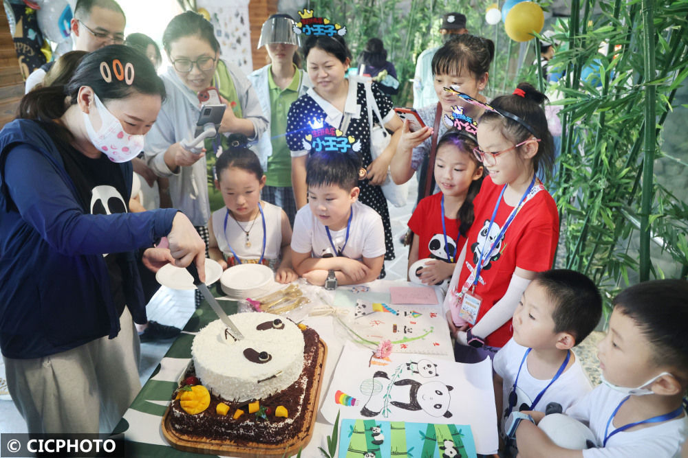 ↑2022年8月7日,在江苏省南通市南通森林野生动物园,工作人员在与游客分享大熊猫图案的生日蛋糕。CICPHOTO/徐培钦 摄