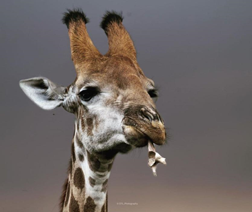 还有这张拍摄于 2018 年,地点不详。这只长颈鹿叼着一个羚羊头骨。