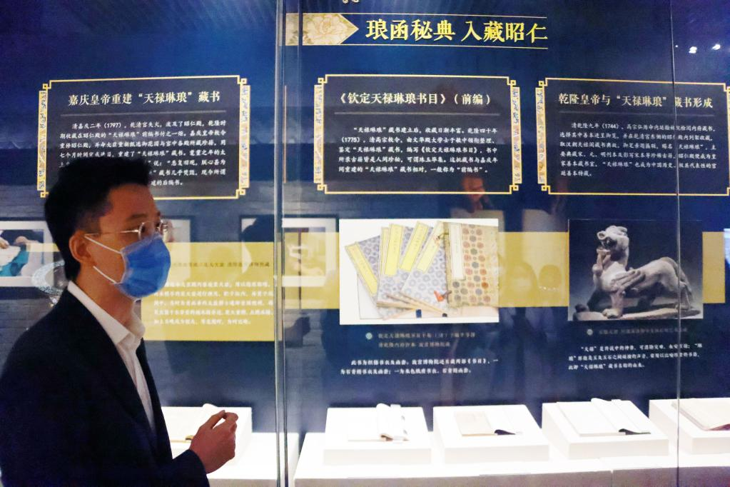 8月3日,在位于北京的国家典籍博物馆,参观者在预展上了解展出的重点古籍及修复成果。