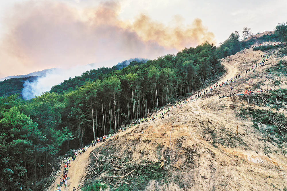 8月25日,重庆璧山区八塘镇,来自云南的森林消防队员正在阻击山火蔓延。崔力/重庆日报 图