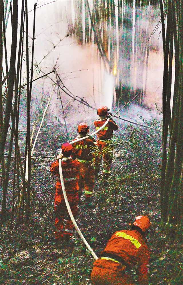 消防员承受着高温天气和烈火的双重炙烤,四肢隔着衣物仍被熏黑。