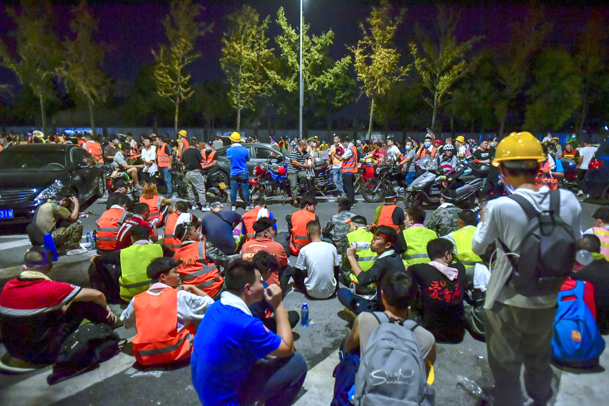 8月25日晚,重庆北碚区歇马街道山火现场的山脚下,众多“骑士”志愿者等待上山运送物资。