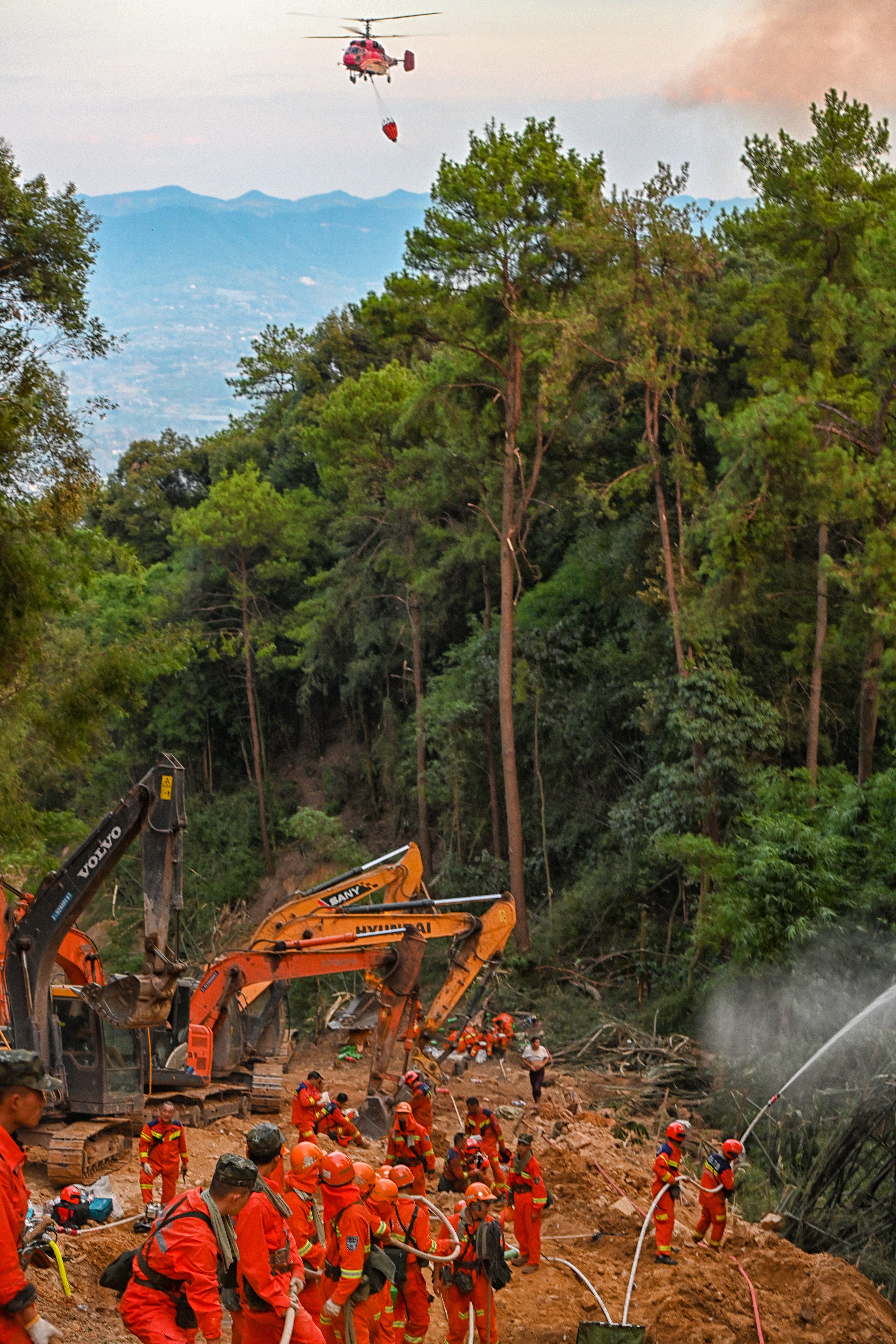 8月25日,重庆北碚歇马,重庆市应急管理局航空救援总队的直升机正在山火上空洒水灭火。齐岚森/重庆日报 图