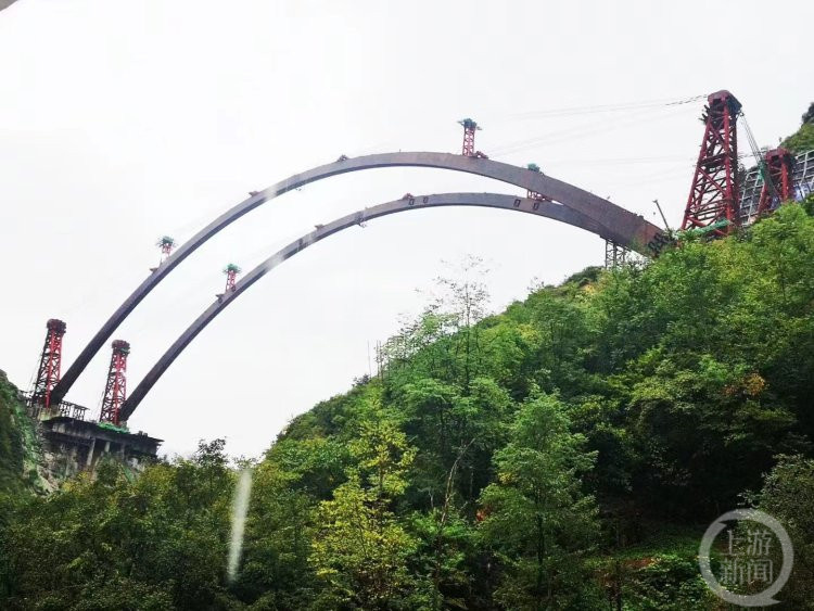 “受地形条件限制,拱肋分别从外侧进行平转,两岸各有一榀拱肋最大拱弦仰角达到70度,贴着外侧山体的树木末梢转过,相当于给大山‘梳头’,城开高速B1标项目总工李鸣说,大桥首次采用不设合龙段的方式,直接通过转体实现两岸拱肋精密对接合龙。