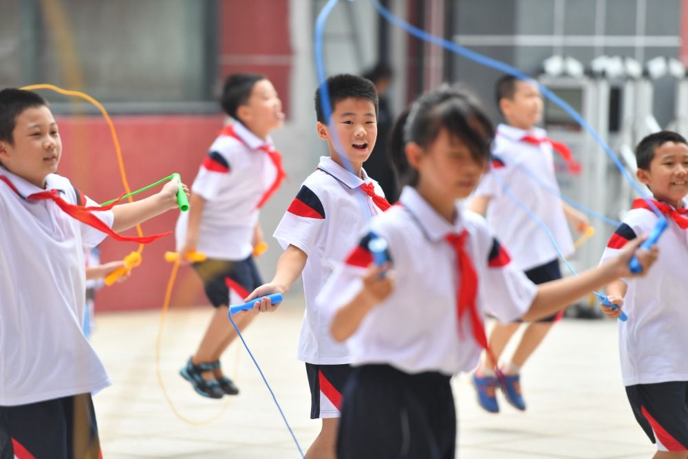 8月29日,在长沙市天心区青园南湖小学,学生在体育课上跳绳。