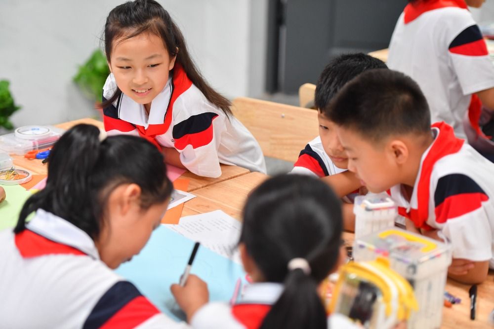 8月29日,在长沙市天心区青园南湖小学,学生在劳动课上讨论工艺作品制作。