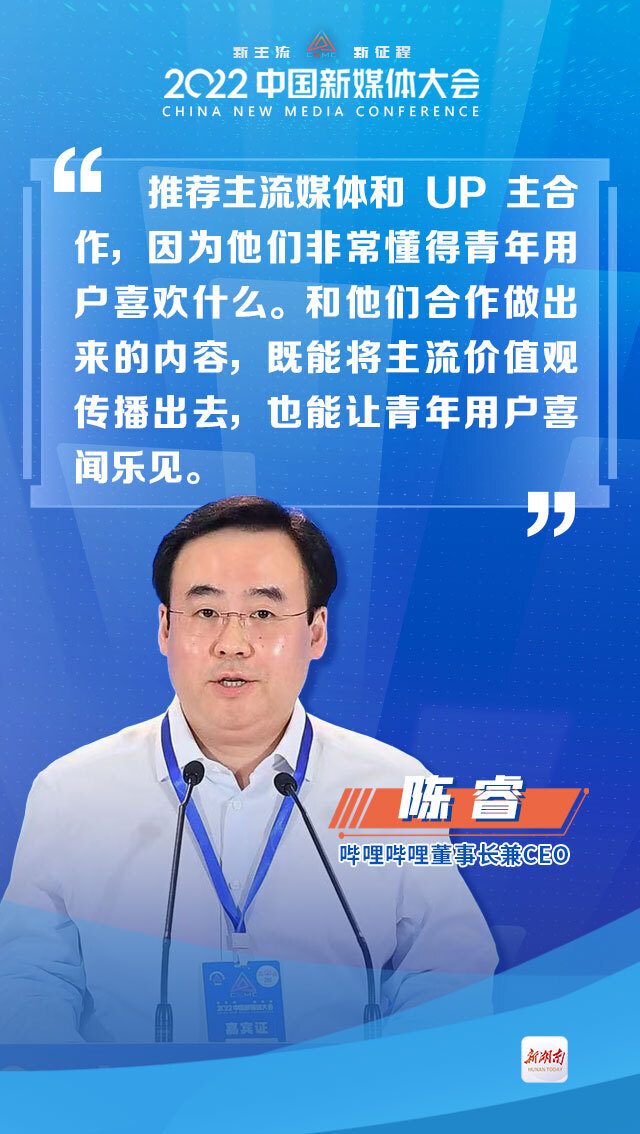 “推荐主流媒体和UP主合作,因为他们非常懂得青年用户喜欢什么,和他们合作做出来的内容,既能够把主流的价值观传播出去,也能够让我们的青年用户喜闻乐见。”在2022中国新媒体大会主论坛上,哔哩哔哩董事长兼CEO陈睿邀约主流媒体“牵手”UP主。