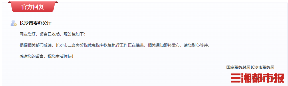 三湘都市报·新湖南客户端8月23日讯(全媒体记者 卜岚 实习生 贠乐桐)近日,有市民咨询长沙二套房契税优惠方案何时开始执行的问题。8月22日,国家税务总局长沙市税务局对此回复称,根据相关部门反馈,长沙市二套房契税优惠税率恢复执行工作正在推进,相关通知即将发布。