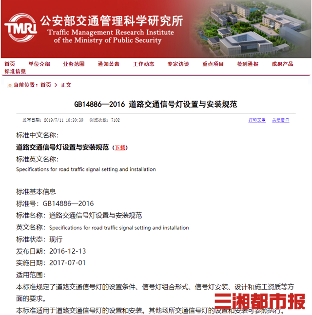 记者了解到,所谓的“新规”为《道路交通信号灯设置与安装规范》GB14886—2016,根据公安部交通管理科学研究所网页显示,该标准发布于2016年12月13日,于2017年7月1日起实施。标准中规定了道路交通信号灯的设置条件、信号灯组合形式、信号灯安装、设计和施工资质等方面的要求。