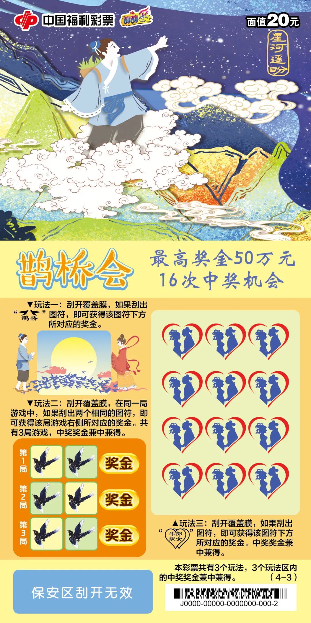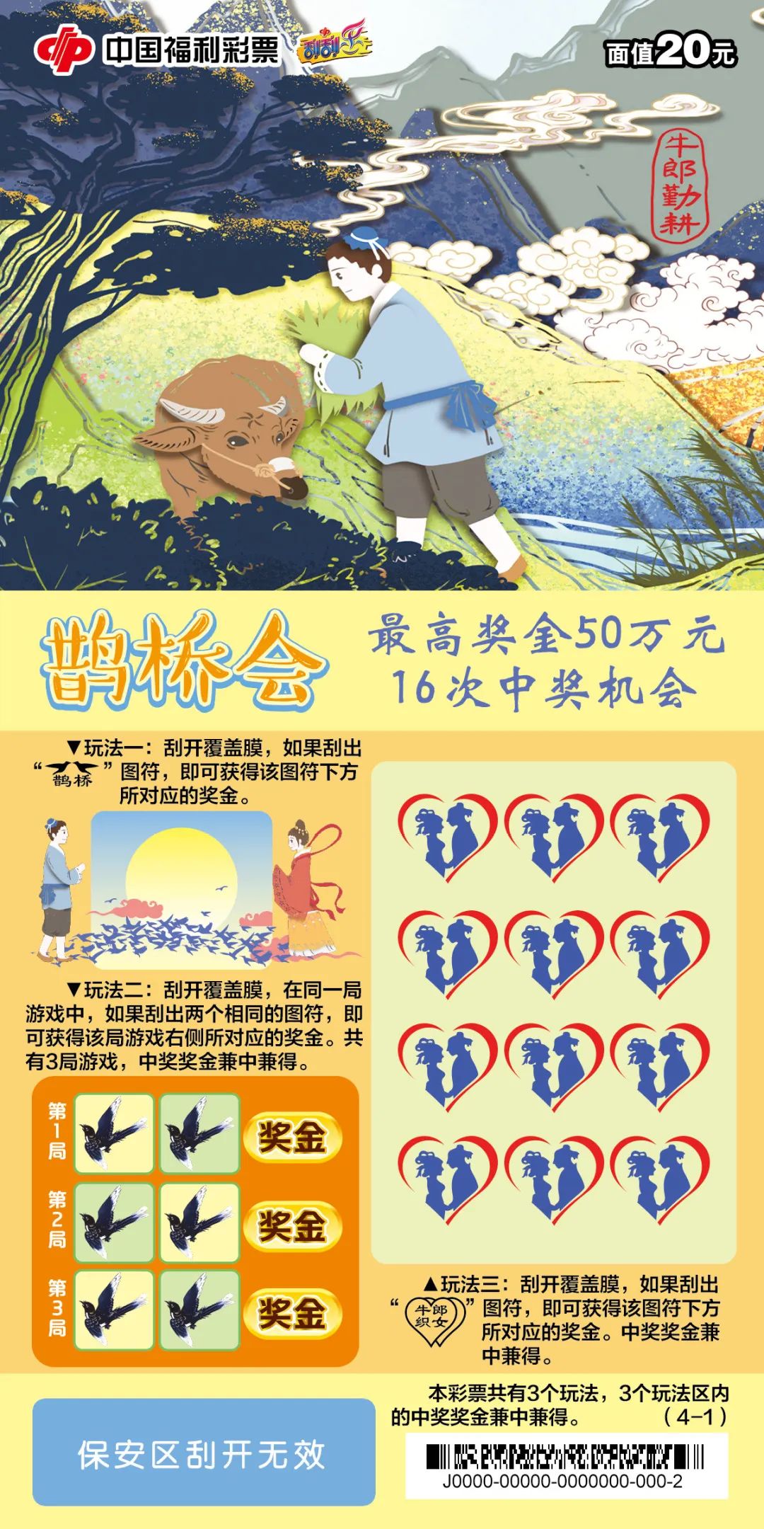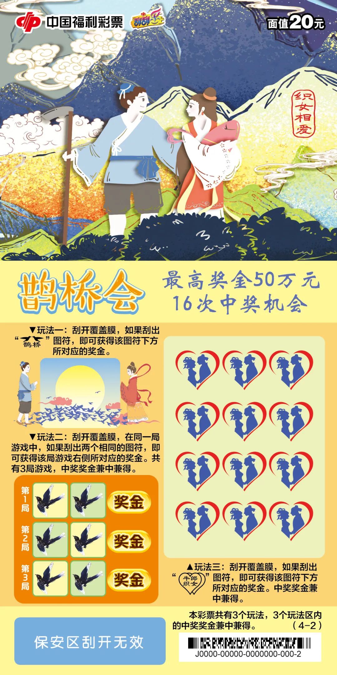 中国福利彩票以民间传说“七月七喜鹊在银河上搭桥、让牛郎织女在桥上相会”为主题,设计了一款福彩刮刮乐文化主题游戏“鹊桥会”,歌颂了中国劳动人民的坚贞爱情,对追求美好生活的强烈愿望起到积极作用。