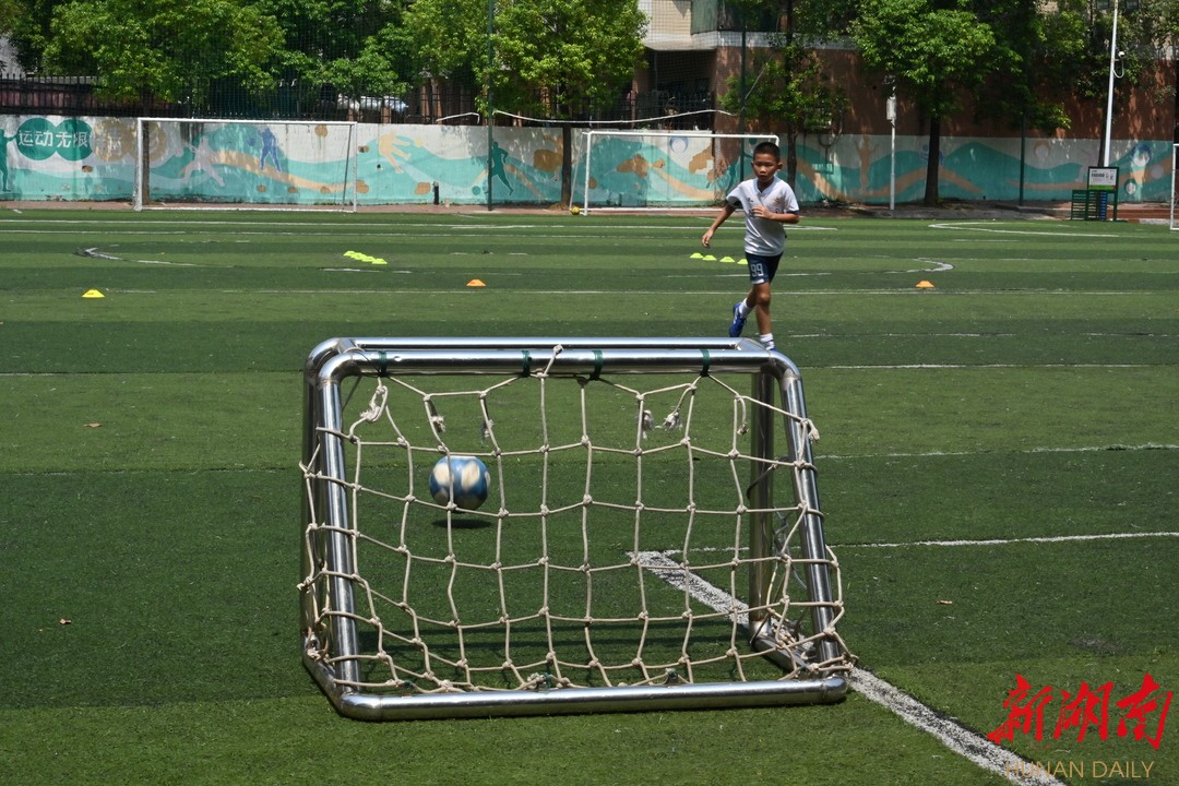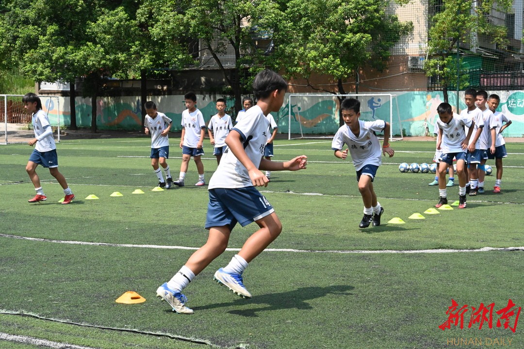 新湖南客户端8月1日讯(记者 胡旻 实习生 文湘玥 刘蓓琦)一进入长沙市德馨园小学的校门,映入眼帘的便是一块绿色草皮地,一群身着球衣、佩戴装备的足球小将们在教练的指导下井然有序地训练着,灼热的阳光下,他们正为足球梦而努力奋斗着。