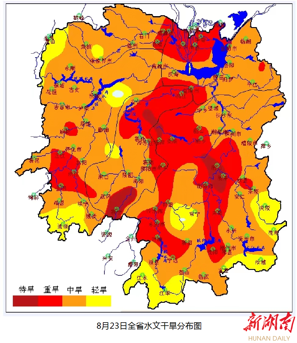 新湖南客户端8月25日讯(记者 达庆玙 通讯员 王亮 何鹏程)“7月以来的干旱过程,于8月23日达到高峰,全省85%以上面积出现中度以上水文干旱。8月24日,受降温降雨天气影响,湘南、湘东旱情有所缓解。”8月25日清早,省水文水资源勘测中心(简称“省水文中心”)将最新全省雨水旱情分析及趋势预测材料报送省水利厅,作为防旱抗旱决策的重要依据。