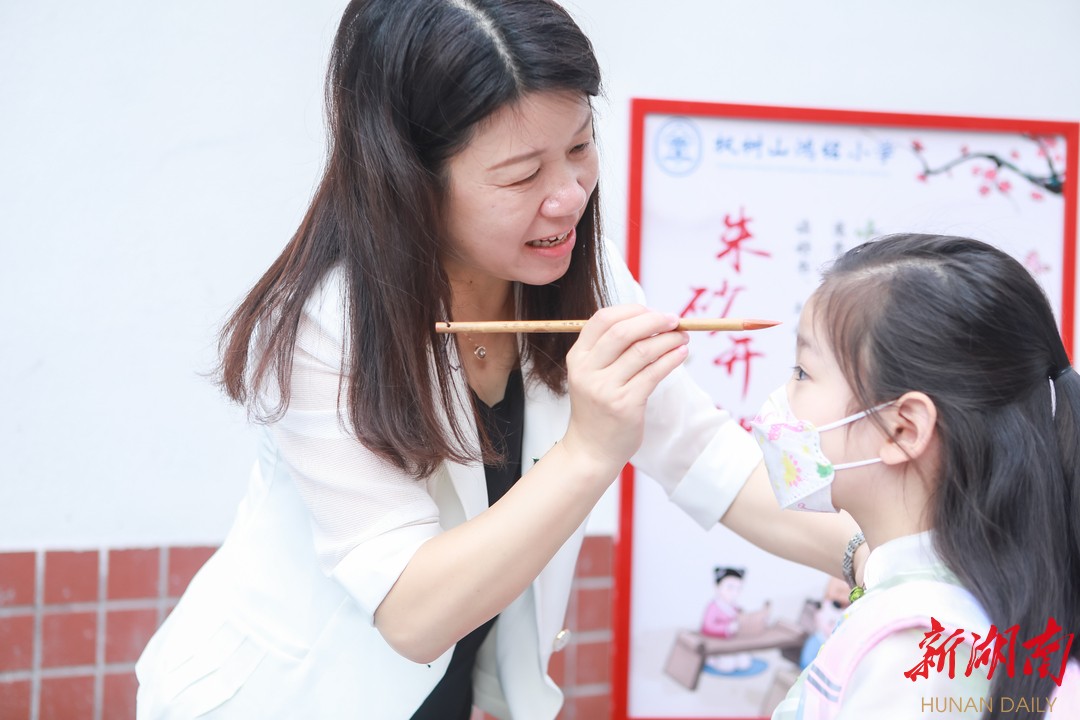 “一撇一捺,立于天下。”200余名师生跟随着校长妈妈的笔画,一起写下“人”字。校长吴友珍对小朋友们的嘱托:“今天是你们第一天走进小学校园,我们一起写人字。开笔写人,启蒙人生,感悟做人。希望你们写人字,学做人,脚踏实地,做个德智体美劳全面发展的人。”随后,弟子递拜师帖、向师者敬献束脩礼后,全体弟子再向师者行拜师大礼,寓意“师道尊崇,感念师恩“。师者回礼,弟子聆训。
