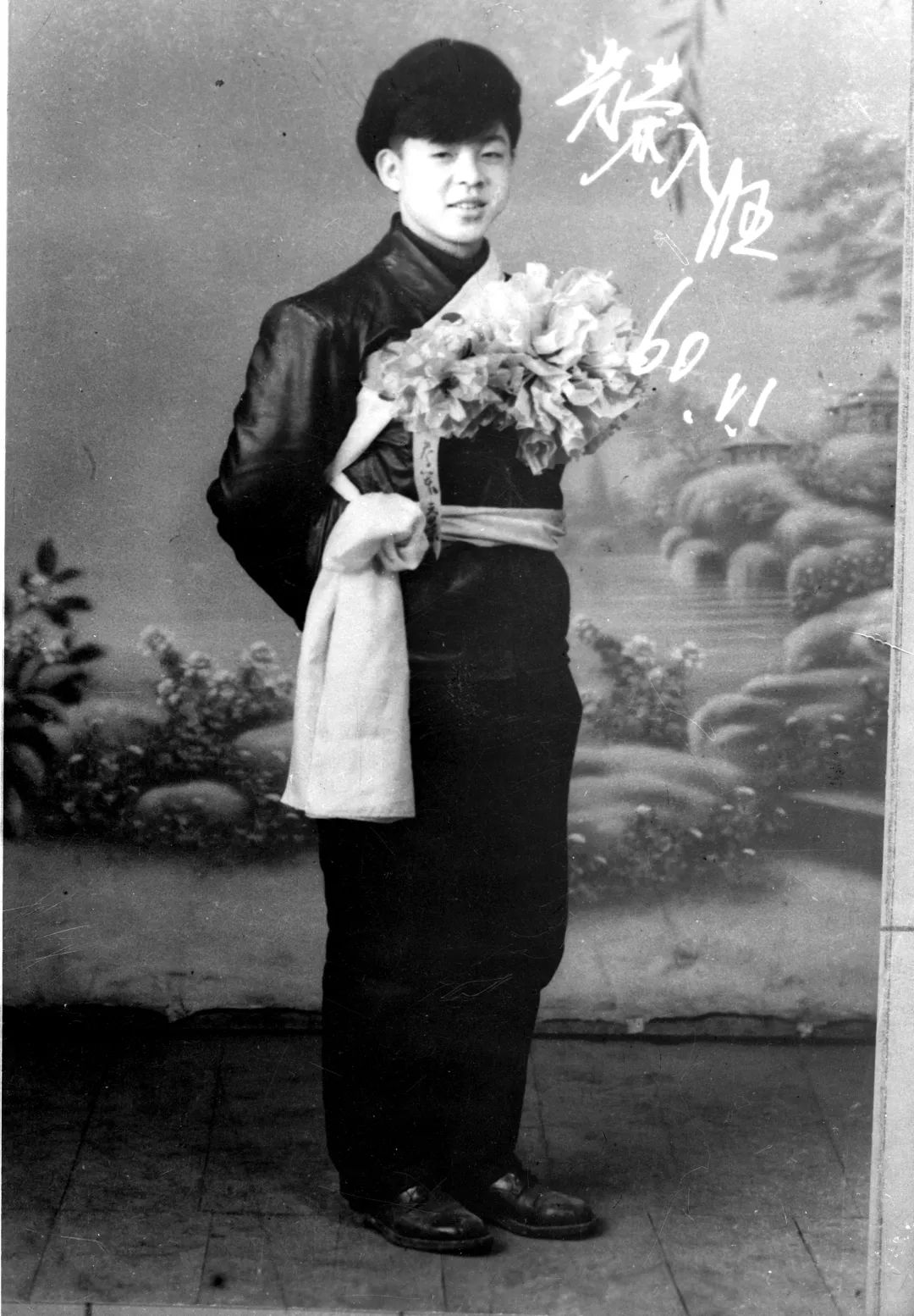 (1960年元旦,入伍前的雷锋身着便装披红戴花留影)