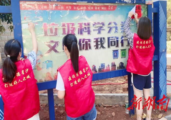 (丁家岭社区“巾帼志愿服务队”正在东九路清理宣传栏“牛皮癣”。)