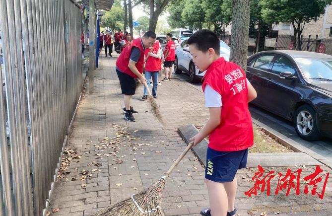 正值暑期,象彭俊凯、彭姗姗这样的亲子志愿服务家庭还为数不少。在丁家岭社区东九路沿线人行道,“红马甲”队伍中,活跃着一对父子,家住学府家境小区的党员唐耀武带着11岁的儿子唐增希正在清扫落叶。虽然天气炎热,在爸爸指导下,唐增希顾不上擦去脸上的汗水,干得象模象样。“看到社区招募志愿者的消息后,我第一时间报了名,今天特意带着儿子来参加,我觉得这是孩子暑假中最好的社会实践。”唐耀武说道。