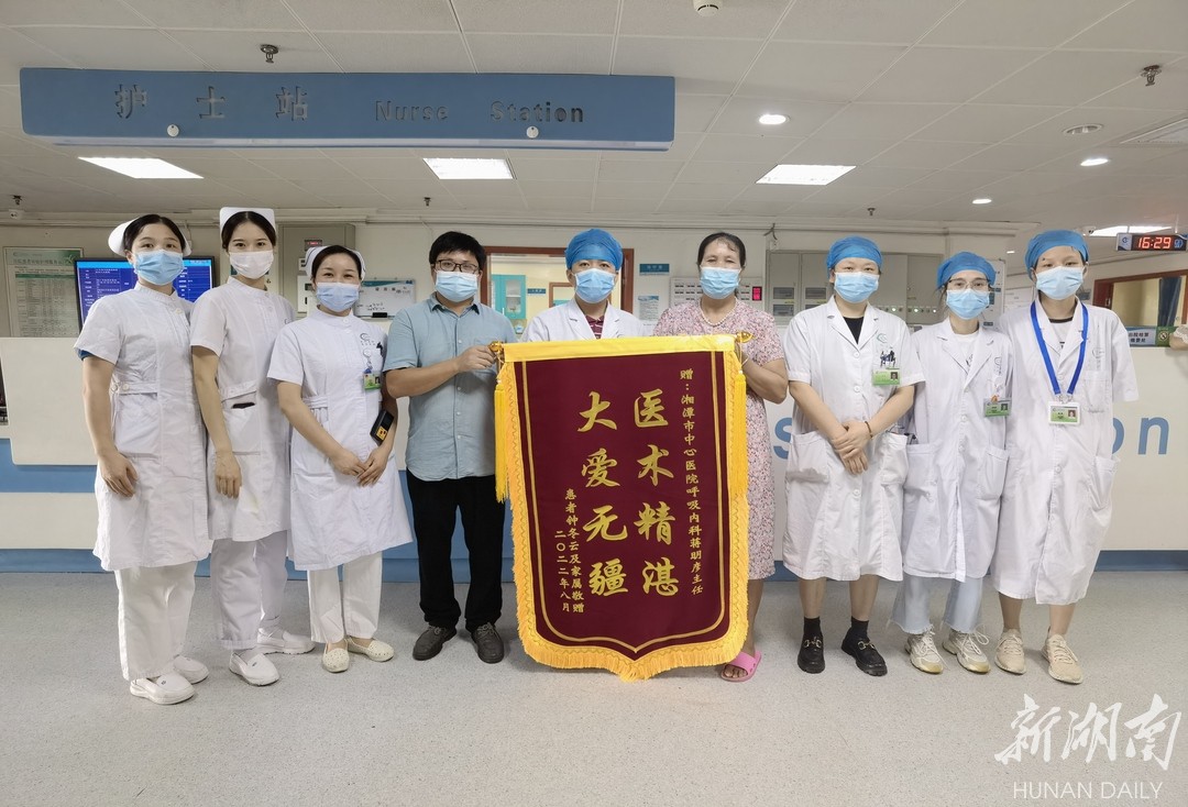 8月2日,湘潭市民陈兰英将一面写有“医术精湛,大爱无疆”的锦旗,送到湘潭市中心医院呼吸与危重症医学科主任蒋明彦手中。陈兰英握住蒋明彦的手,激动得说不出话来。