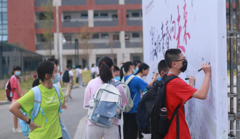 二中枫溪学校初中部专门在校门口设置“录取通知书”打卡拍照墙,“激扬青春向未来”签名墙和合影框,教师们在教室为孩子们准备好课本、校服和入学礼,学子们纷纷在校门口拍照打卡,以饱满的姿态迎接新学期的到来。