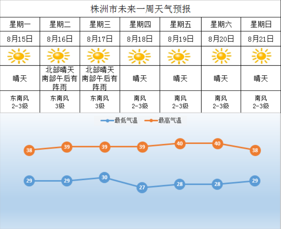 15号上午,记者从株洲市气象台了解到,未来十天(8 月 15~24 日)株洲市晴热高温天气将继续保持,最高气温可达 40℃左右。
