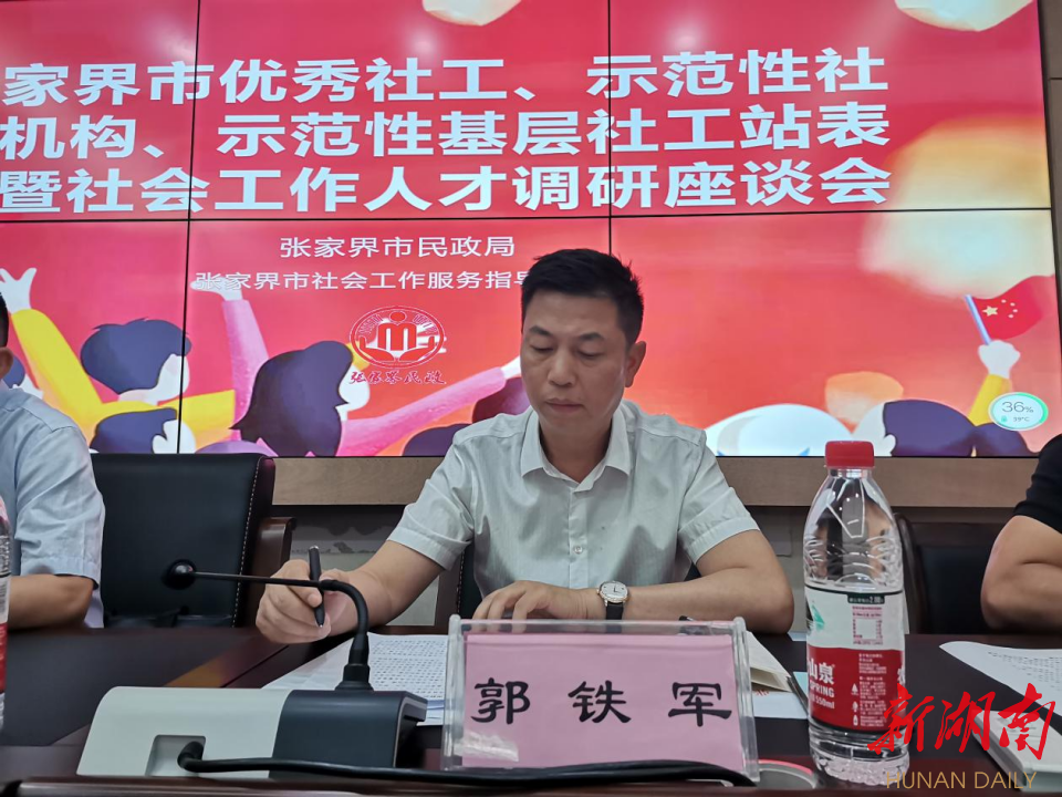 新湖南客户端8月23日讯(通讯员 刘珂寒 图/汪丽莉 赵文娟)8月22日,张家界市民政局组织召开张家界市优秀社工、示范性社工站、示范性社工机构表彰暨社会工作专业人才调研座谈会,会议由市民政局党组成员熊炜主持,市民政局党组书记、局长郭铁军参加会议并讲话。