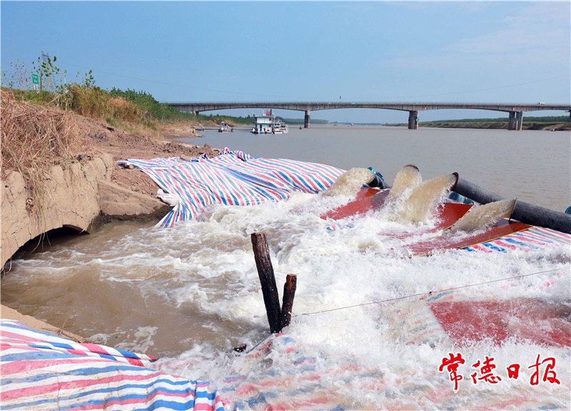 (鼎城区蒿子港镇在仁和闸进水口筑坝架设临时机埠,通过澧水两级提水入北干渠补水)
