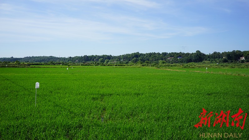 8月10日,桃源县盘塘镇红岩山村富硒生态稻米示范区,水田平旷,晚稻秧苗茁壮生长,绿意盎然。前不久,这片田地的烟叶收割完,便重新整地种上了晚稻。