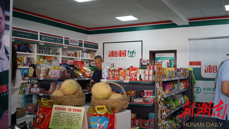 在盘塘镇朱家港村“湘村636”门店,记者看到,门店中食品、日用品等一应俱全,还专设一处展柜,销售富硒大米、哈密瓜等烟区产业综合体农产品。