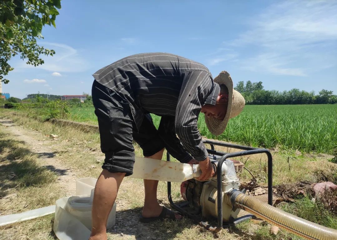 (近段时间,常德市高温少雨,现阶段又是晚稻秧苗生长的关键时期,为解决地势较高的稻田用水难问题,连日来,武陵区河洑镇白鹤庵村的种粮大户在田间设置抽水机,加大马力为稻田供水。)