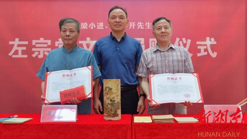 捧着“左公”握过的毛笔,想见他势如破竹的字迹;目睹“左公”所记经费禀折,仿佛触到他清廉治军、抬棺西征吹过的风沙……8月3日,左宗棠第五世外孙梁小进、梁小开代表母亲左景范,向湘阴县左宗棠生平事迹陈列馆捐赠9件文物及藏品。