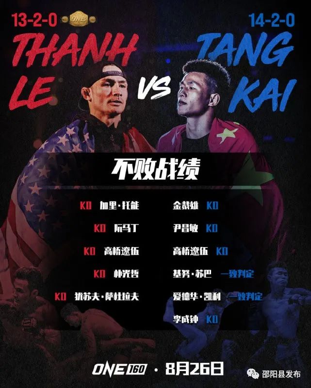 ONE冠军赛于8月26日晚在新加坡室内体育馆举办了ONE 160大型格斗赛事。在联合主赛羽量级世界冠军战中,来自中国的挑战者、“KO男神”唐凯对阵现役冠军、美国人丹勒,最终双方打满五回合,唐凯经一致判定拿下比赛,夺得中国首条男子综合格斗金腰带,改写了中国综合格斗的历史!26岁的唐凯也成为中国首位男子综合格斗世界冠军,也是中国最年轻的世界冠军。