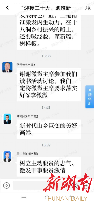 对湘西人而言,每个人都可以说见证了十八洞的“山乡巨变”,所以导读内容一发出来,委员们立即纷纷畅所欲言——“首倡之地,彰显首创之为!”“十八洞村是新时代中国农村的缩影,小小的山村,伟大的时代!”“家乡巨变感党恩,奋斗图强报党情;脱贫攻坚出样本,乡村振兴赛花魁!”……读书群就像一所没有围墙的图书馆,打造了委员学习新阵地,大家一同学习、一同交流,这一则则读书、荐书、讲书、评书的留言,是一种共享式体验,碰撞出思想火花,使读书群内氛围非常活跃,如同“搅”起了一池春水。