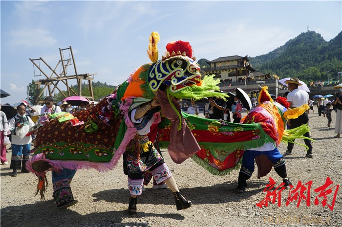 8时27分,迎秋开始。20名巴代雄(祭司)敲着大锣、吹着长号、举着苗幡,簇拥着秋公秋婆进入秋场。紧接着,由花垣各乡镇组成的舞蹈队、舞龙队、苗鼓队等依次入场。
