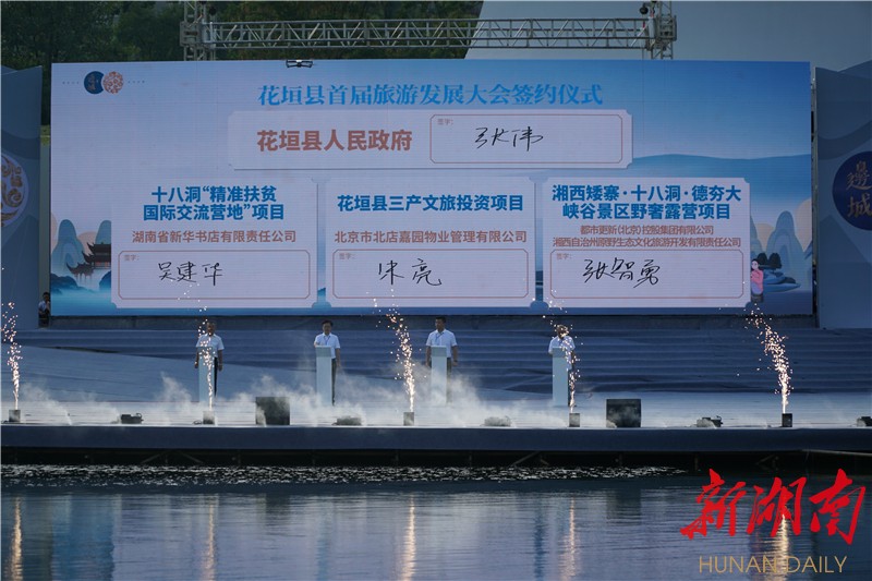 在开园仪式上,十八洞“精准扶贫国际交流营地”项目、花垣县三产文旅投资项目、湘西矮寨·十八洞·德夯大峡谷景区野奢露营等项目成功签约。
