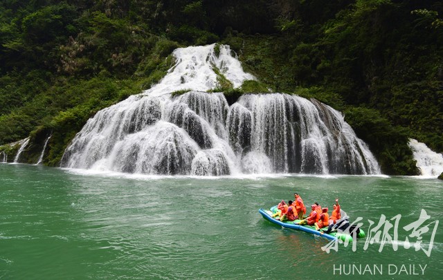 皮筏艇飞驰,沿途黑蛇湾、鸳鸯洲、水洞子瀑布等风景,转眼即逝。水洞子瀑布是茅岩河漂流一绝——从数十米高的崖壁泻出,漫流过三级高低不平的石壁,形成长短不一的三叠水瀑,似白练飞落茅岩河中。只要游客提出要求,船工便会驾艇从瀑布中穿越而过,仿佛到了花果山“水帘洞”。