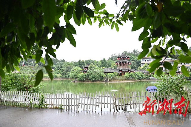 走出水上乐园,映入眼帘的是佳麓湖,游客在湖中风雨凉亭嬉戏;佳麓湖一侧的玫瑰花海生态园里,有游客在拍照打卡……